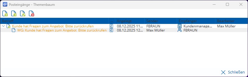 - Tragen Sie im Posteingang die Erledigung des Posteingangs ein, z. B. Antworten auf Fragen zum Angebot des Kunden.